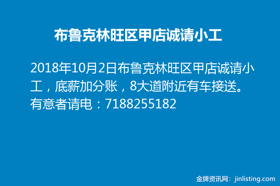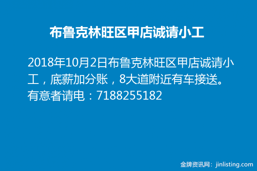 布鲁克林旺区甲店诚请小工,底薪加分账,8大道附近有车接送。有意者请电:7188255182