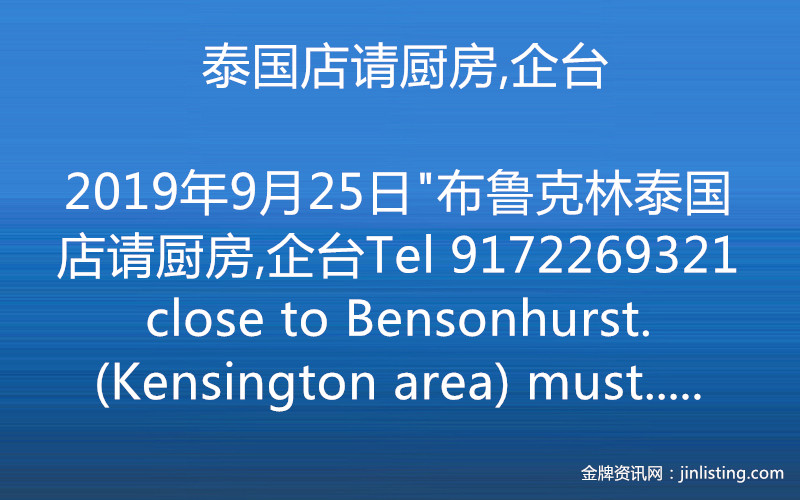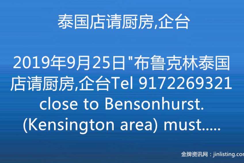 “布鲁克林泰国店请厨房,企台 Tel 9172269321 close to Bensonhurst. (Kensington area) must speak a lil bit English”