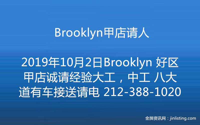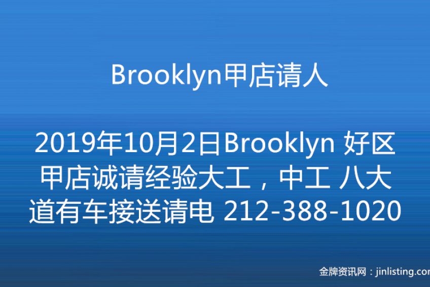 Brooklyn 好区甲店诚请经验大工,中工 八大道有车接送请电 212-388-1020