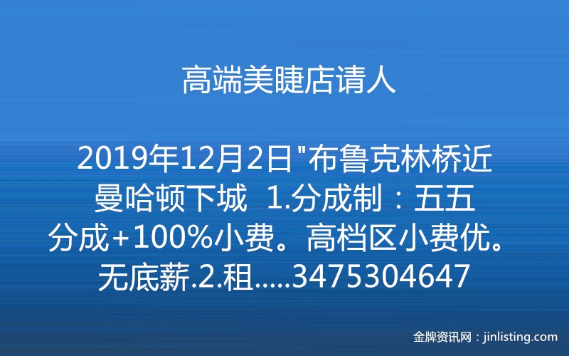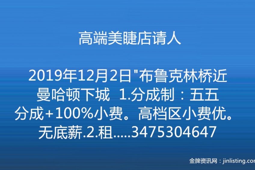 高端美睫店请人 “布鲁克林桥近曼哈顿下城高端美睫店请人 1.分成制:五五分成+100%小费。高档区小费优。无底薪。 2.租用床位:$500/月 有兴趣者请联系金小姐:3475304647”