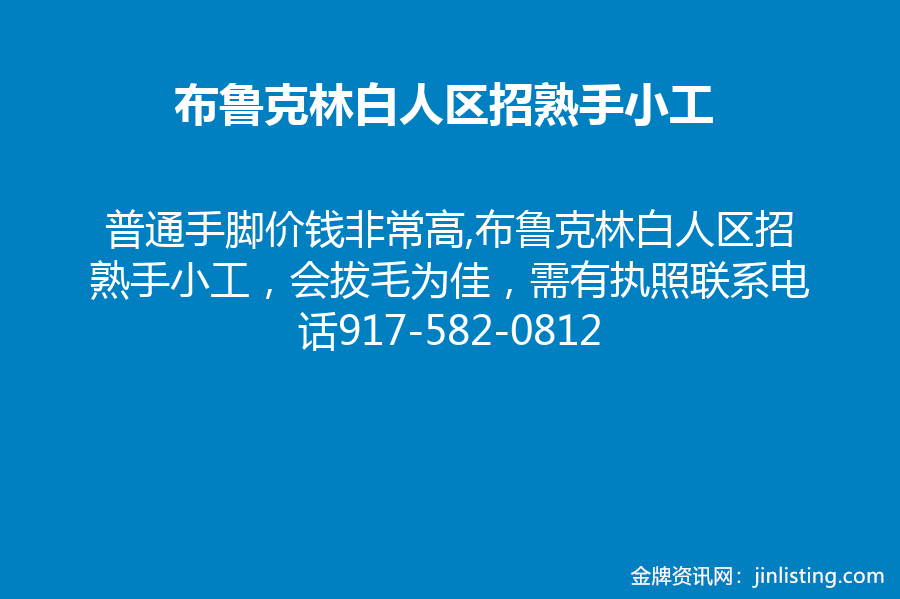 布鲁克林白人区,普通手脚价钱非常高!!!布鲁克林白人区招熟手小工,会拔毛为佳,需有执照。客人素质好,小费好,店内环境好,老板事少, part time 和半天均可。 店在C车地铁口,一分钟到G车,距离N.G.R.2.3.E只有五分钟路程。20分钟地铁到八大道。联系电话917-582-0812 也可发短信