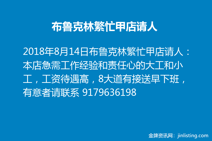 布鲁克林繁忙甲店请人:本店急需工作经验和责任心的大工和小工,工资待遇高,8大道有接送早下班,有意者请联系 9179636198