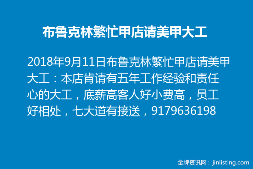 布鲁克林繁忙甲店请美甲大工:本店肯请有五年工作经验和责任心的大工,底薪高客人好小费高,员工好相处,七大道有接送,联系电话 9179636198