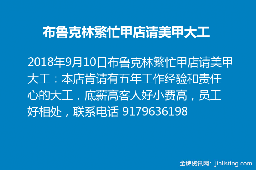 布鲁克林繁忙甲店请美甲大工:本店肯请有五年工作经验和责任心的大工,底薪高客人好小费高,员工好相处,七大道有接送,联系电话 9179636198
