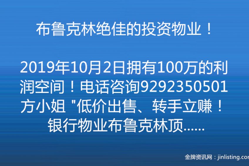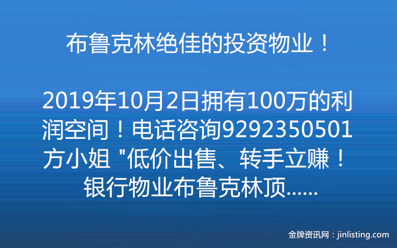 布鲁克林绝佳的投资物业!拥有100万的利润空间!电话咨询9292350501方小姐 “低价出售、转手立赚! 银行物业布鲁克林顶级地段PARK SLOPE 古典式一家庭: Brownstone, 紧挨展望公园,近地铁,共计四层,Zoning R7A, 可改建成三家庭,现有面积4620平方英尺,地税1万3,为难得一见的银行物业,市值达500万以上!开价仅”