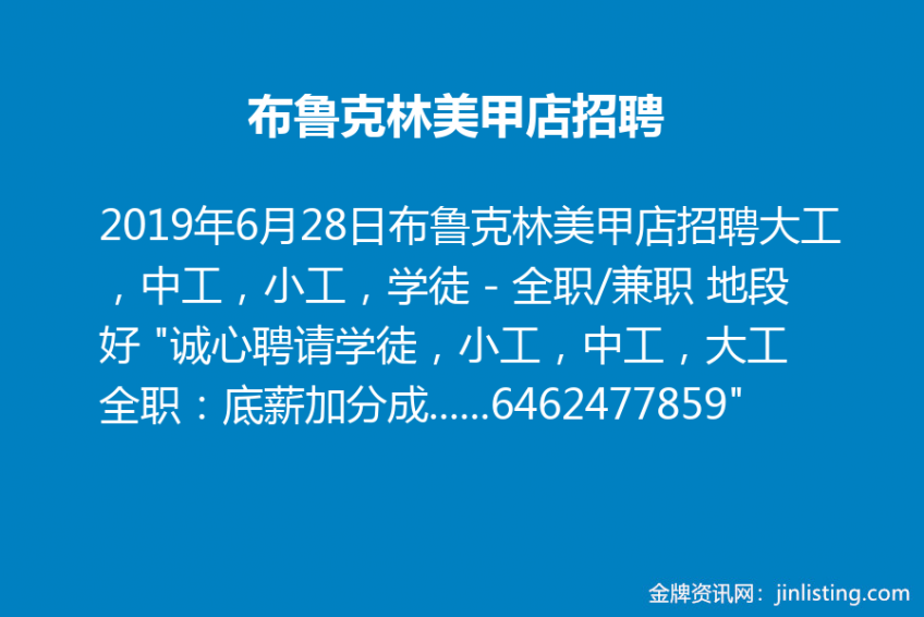 布鲁克林美甲店招聘大工,中工,小工,学徒 – 全职/兼职 地段好 “诚心聘请学徒,小工,中工,大工 全职:底薪加分成 兼职:小时薪或底薪 两分钟到 A, C 地铁站,巴士站就在店门口 联系人:Amy 联系电话:6462477859”