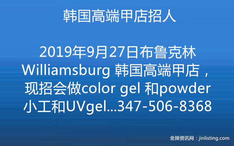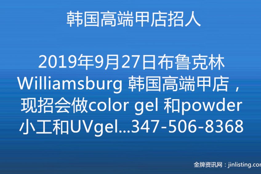 布鲁克林Williamsburg 韩国高端甲店, 现招会做color gel 和 powder 小工和UVgel大工 五六日兼职或全职 联系电话 347-506-8368 如电话未接 可短信联系