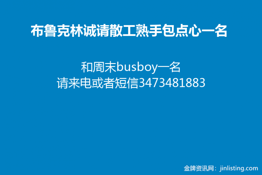 布鲁克林诚请散工熟手包点心一名,和周末busboy一名 3473481883