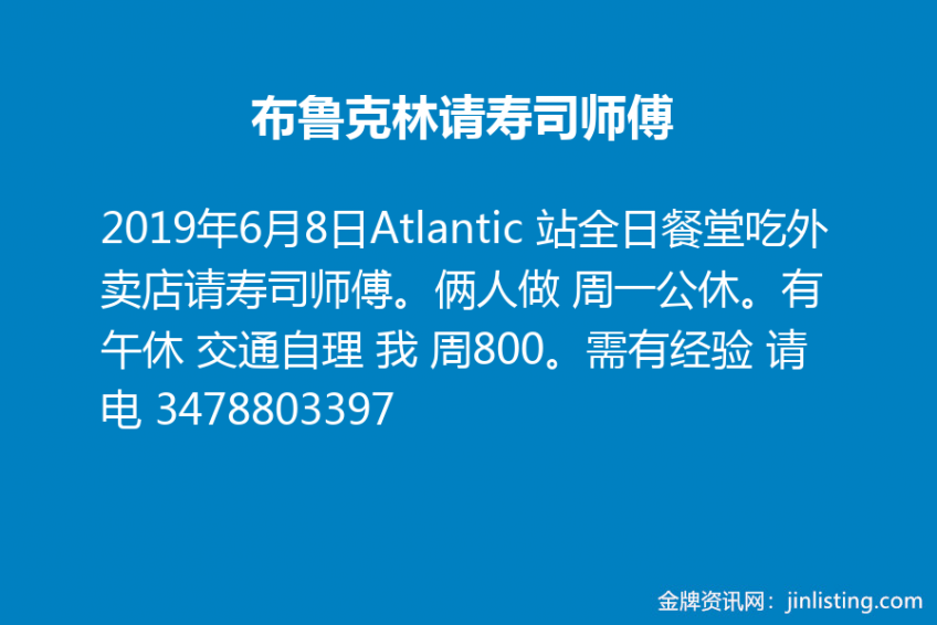 布鲁克林请寿司师傅 Atlantic 站全日餐堂吃外卖店请寿司师傅。俩人做 周一公休。有午休 交通自理 我 周800。需有经验 请电 3478803397