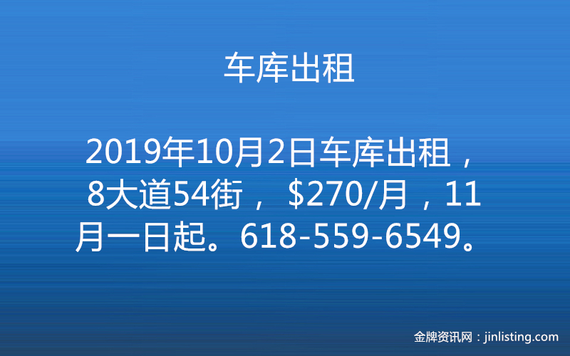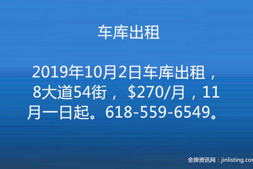 车库出租,8大道54街, $270/月,11月一日起。618-559-6549。