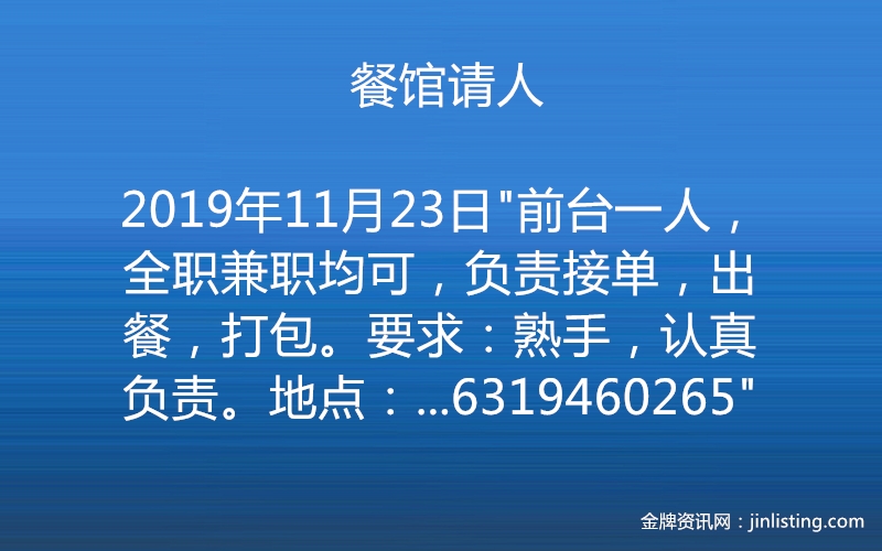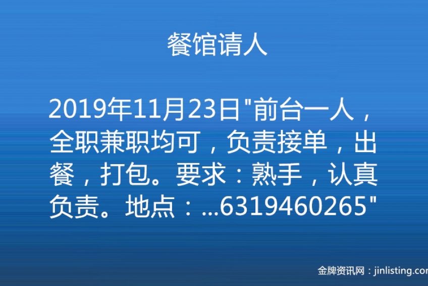 餐馆请人 “前台一人,全职兼职均可,负责接单,出餐,打包。 要求:熟手,认真负责。 地点:布鲁克林白人区 上班时间灵活,交通方便,f车g车,步行2分钟,老板事少。 联系方式:6319460265”