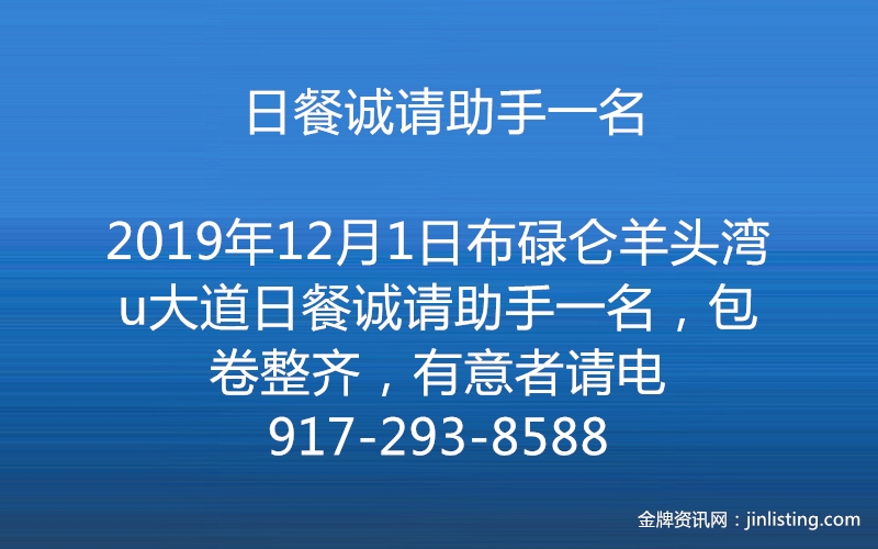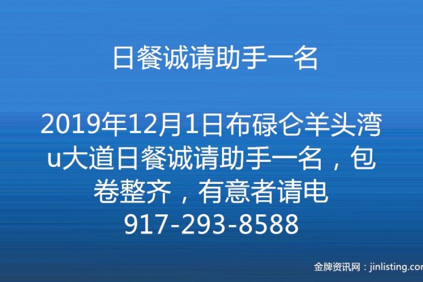 布碌仑羊头湾u大道日餐诚请助手一名,包卷整齐,有意者请电917-293-8588