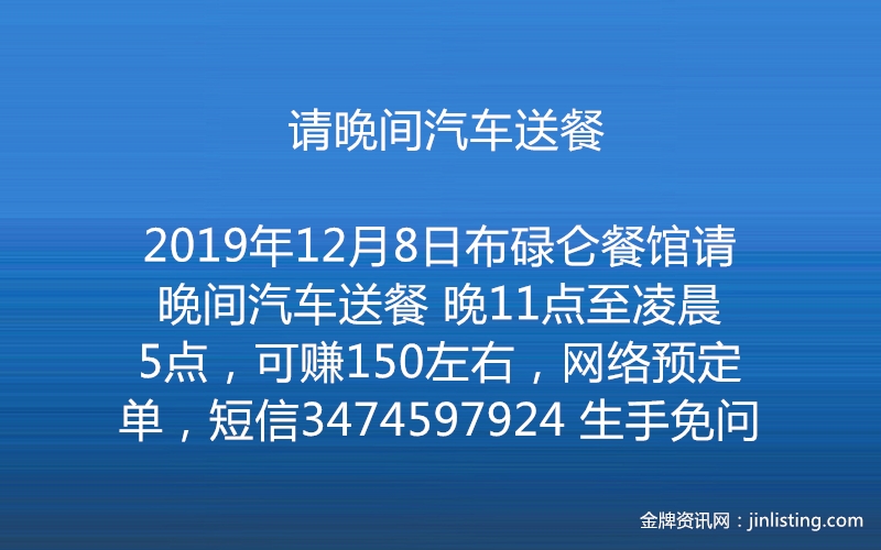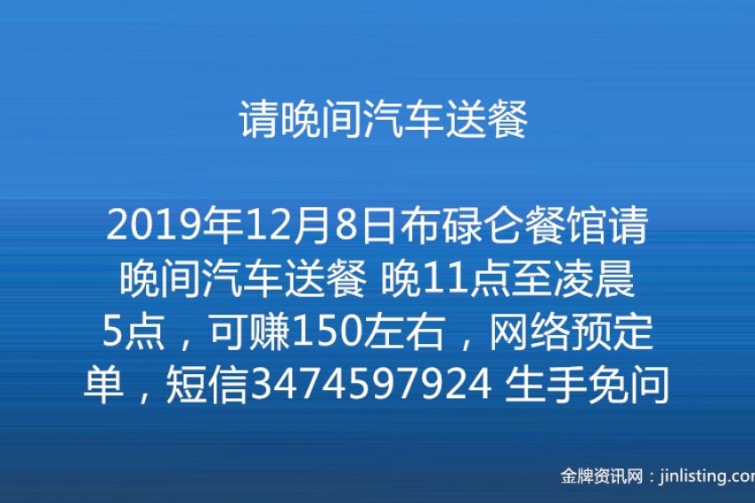 布碌仑餐馆请晚间汽车送餐 晚11点至凌晨5点,可赚150左右,网络预定单,短信3474597924 生手免问