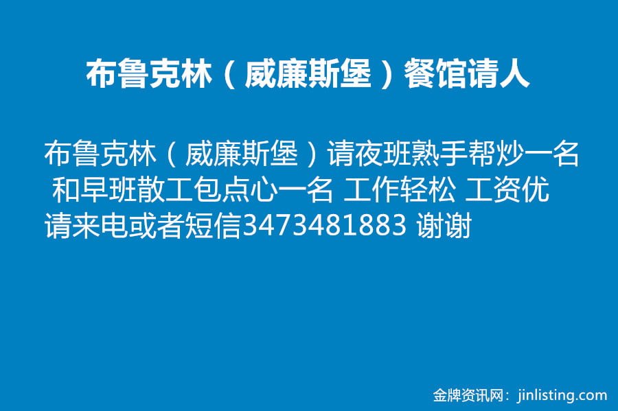 布鲁克林(威廉斯堡)请夜班熟手帮炒一名 和早班散工包点心一名 工作轻松 工资优 请来电或者短信3473481883 谢谢