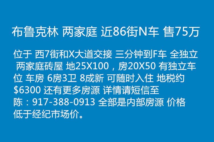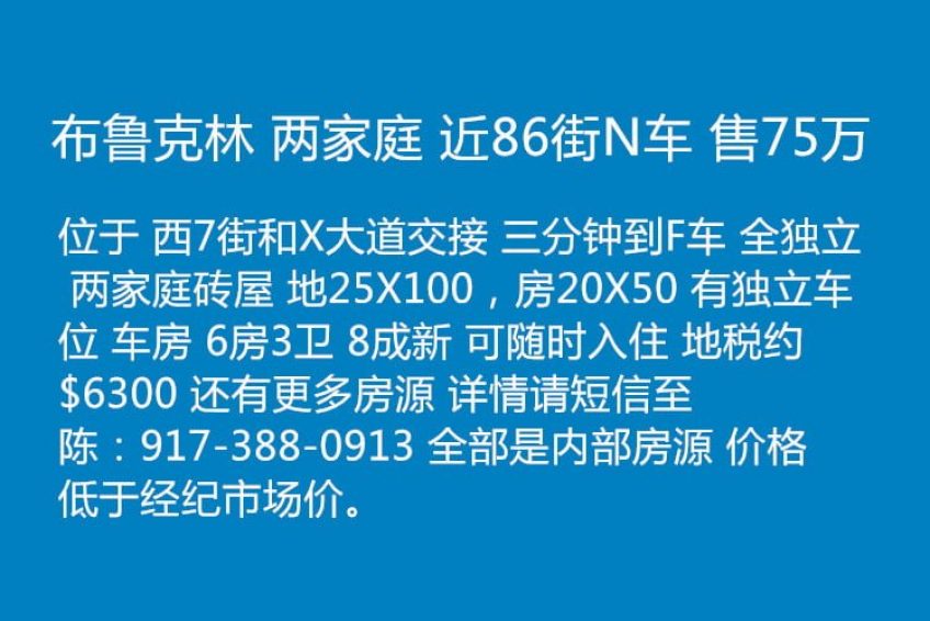 布鲁克林 位于 西7街和X大道交接 三分钟到F车 全独立 两家庭砖屋 地25X100,房20X50 有独立车位 车房 6房3卫 8成新 可随时入住 地税约$6300 还有更多房源 详情请短信至陈:917-388-0913 全部是内部房源 价格低于经纪市场价。 预约看房请提供贷款预批信,如需要也可短信咨询贷款信息,若条件符合可免费提供预批信。