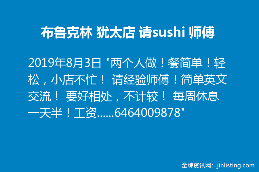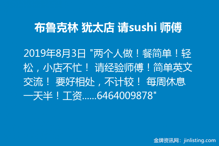 布鲁克林 犹太店 请sushi 师傅! “两个人做!餐简单! 轻松,小店不忙! 请经验师傅!简单英文交流! 要好相处,不计较! 每周休息一天半!工资 800/周 住布鲁克林最佳! 联系电话:6464009878”