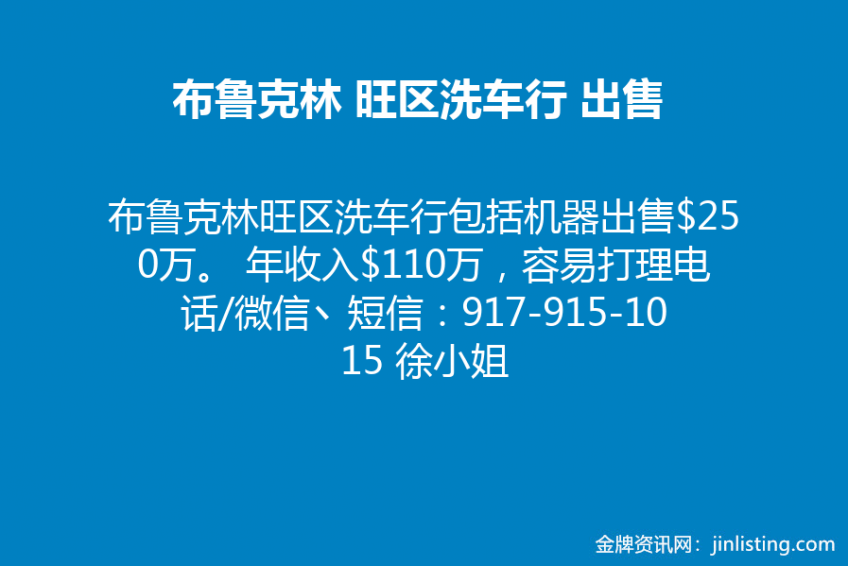 难得生意机会!旺区洗车行(几乎垄断市场的生意)出售 “1,难得生意机会!布鲁克林旺区洗车行包括机器出售$250万。 年收入$110万,容易打理,几乎垄断市场的生意!!! 开销$70万(包括工资,水$6000/月,租金$9500/月,电$3000/月,地税$4万/年和保险$5000/年等等) 净收入可达$40万/年,租约还有25年,机会难得!! 2,布鲁克林Brooklyn洗车修车保养一条龙服务中心,售$120万。 两间保养车的门面,一间洗车,一间修车,面积三千多尺,年营$78万 预购从速,尽快联系: 电话/微信丶短信:917-915-1015 徐小姐Maggie 或 215-200-7243 (**请留言,短信/微信,若忙音,或暂时没有人接电话**) 蓝天地产集团 Henry He(何亨利) 团队”