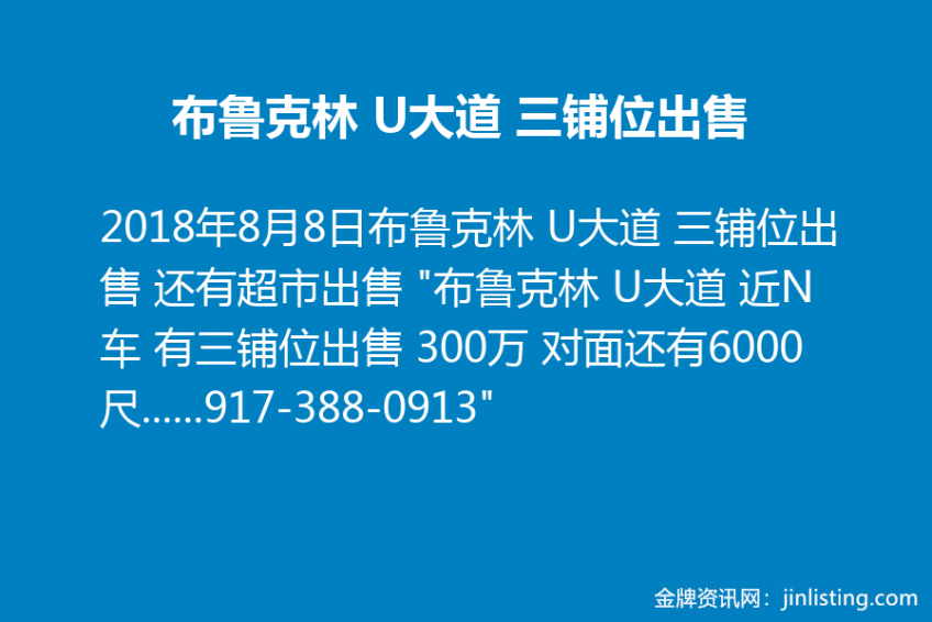 布鲁克林 U大道 三铺位出售 还有超市出售 “布鲁克林 U大道 近N车 有三铺位出售 300万 对面还有6000尺 Met超市出售 430万 在华人聚集越来越多的U大道 抓住机会 商机无限 住宅商业区 交通繁忙 屋主内部出售 未进入市场的 我们还提供贷款咨询,如条件符合可免费提供预批信 欢迎有兴趣和实力的投资买家短信或微信至陈:917-388-0913”