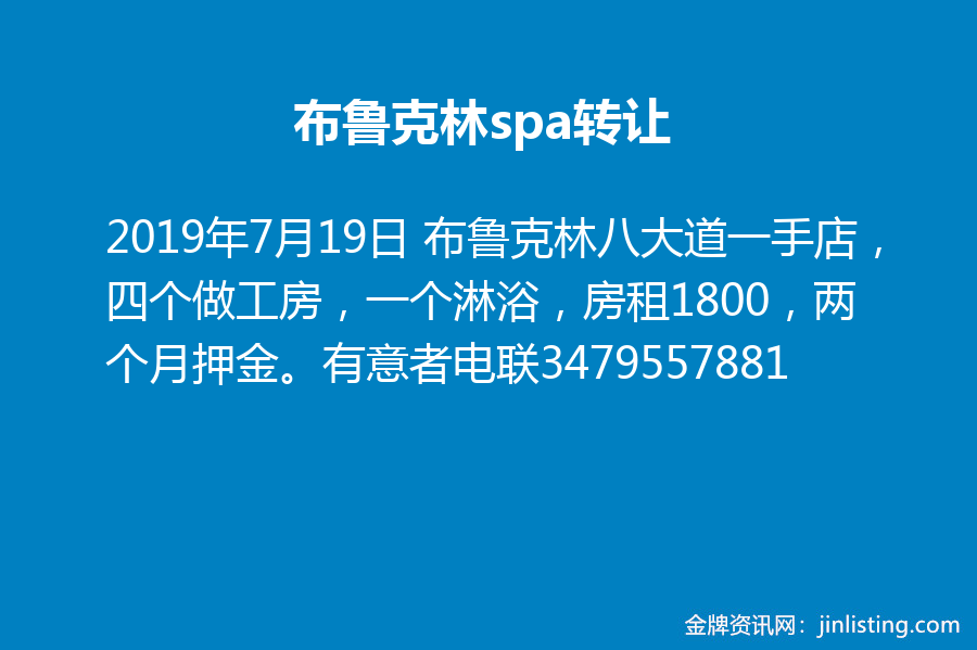 布鲁克林spa转让 布鲁克林八大道一手店,四个做工房,一个淋浴,房租1800,两个月押金。有意者电联3479557881