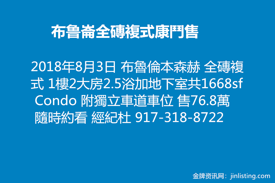布鲁崙全磚複式康鬥售76.8萬      917-318-8722