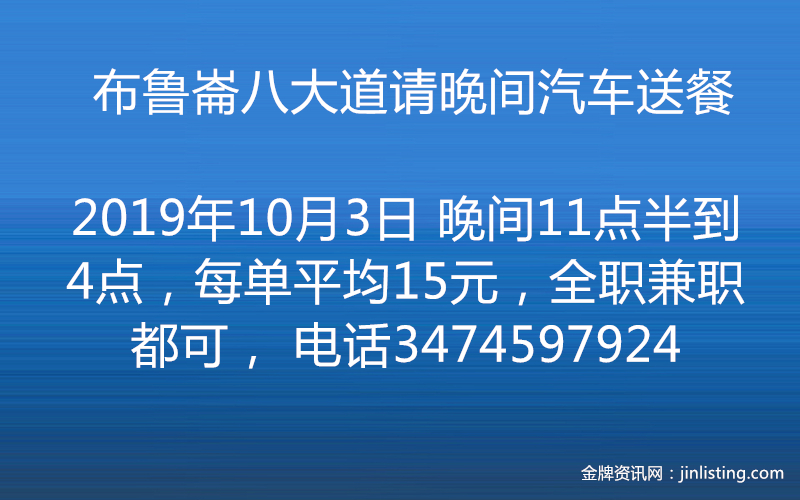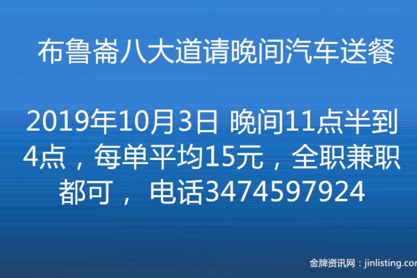 布鲁崙八大道请晚间汽车送餐 晚间11点半到4点,每单平均15元,全职兼职都可, 电话3474597924