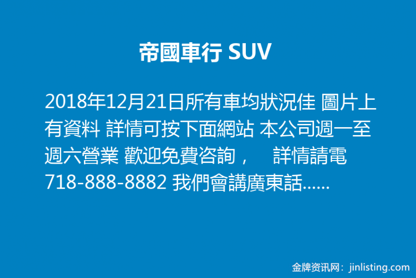 所有車均狀況佳 圖片上有資料 詳情可按下面網站 本公司週一至週六營業 歡迎免費咨詢, 詳情請電 718-888-8882 我們會講廣東話,國語,溫州話,英語 網址: http://www.mrcarauto.com/Dealer-Websites/Mr-Cars-A…to-Sales-Inc-NY/inventory.aspx