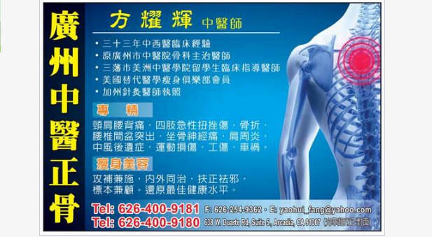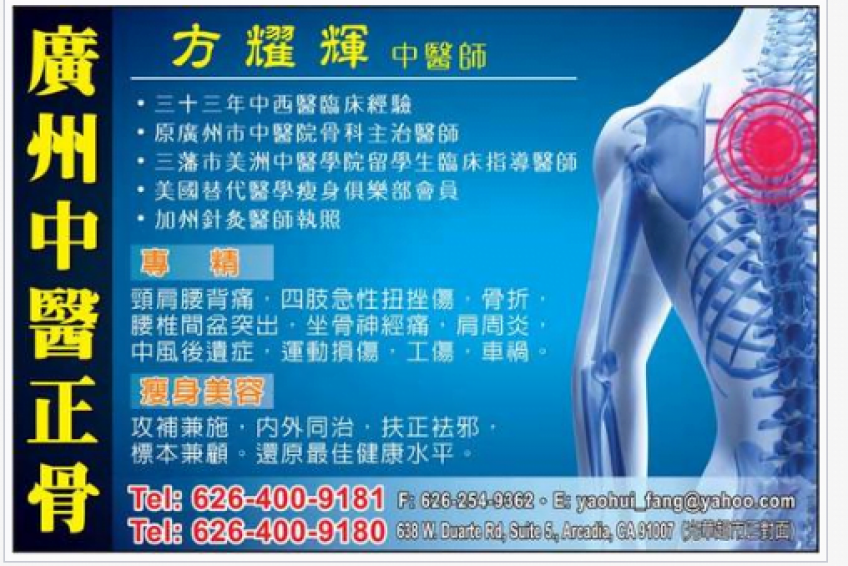 医师简介: 原广州市中医院骨科主治医师 33年中西医临床经验 加州针灸医师执照