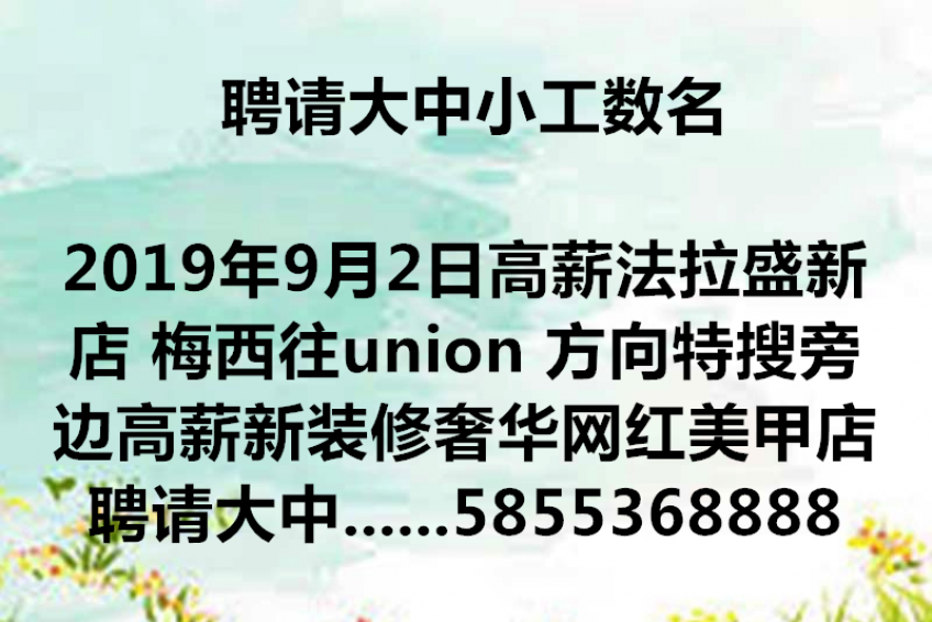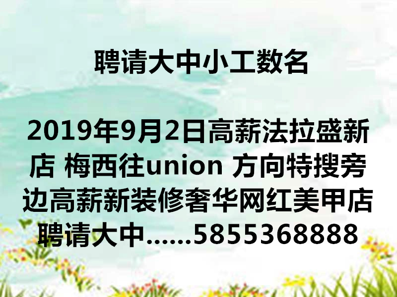 高薪法拉盛新店 梅西往union 方向特搜旁边高薪新装修奢华网红美甲店聘请大中小工数名,小费好,高薪保底。parttime需要,电话5855368888