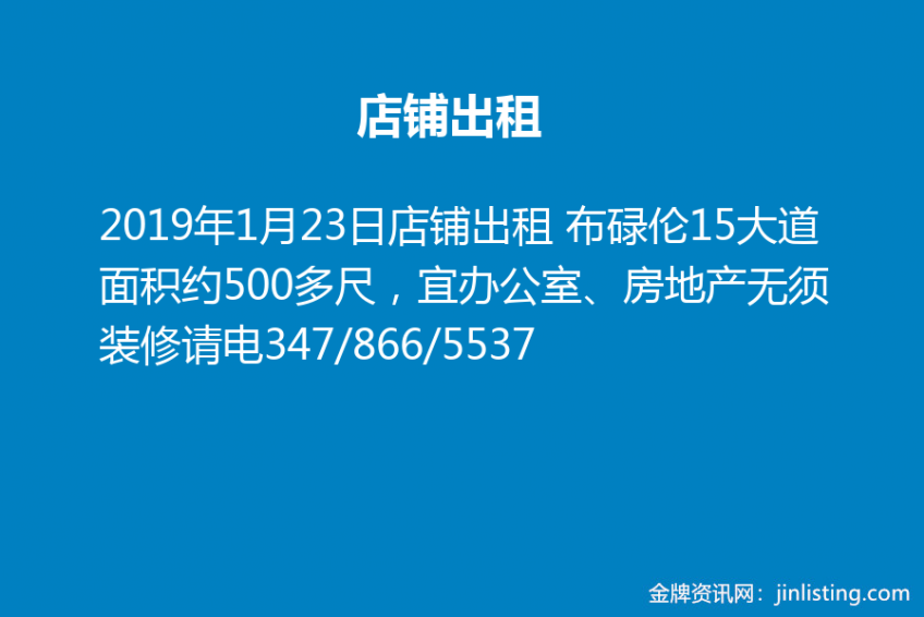 店铺出租 布碌伦15大道面积约500多尺,宜办公室、房地产无须装修请电347/866/5537