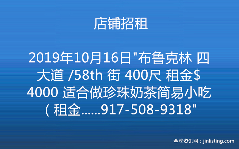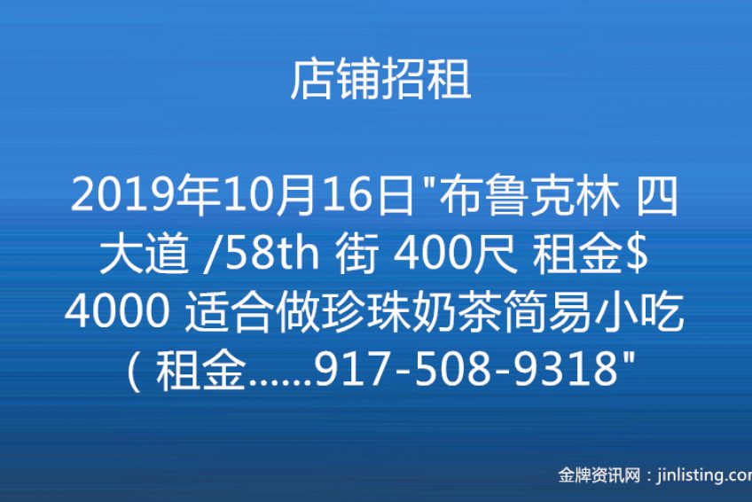 “店铺招租 布鲁克林 四大道 /58th 街 400尺 租金$4000 适合做珍珠奶茶简易小吃(租金含地税 ) 电话:917-508-9318”