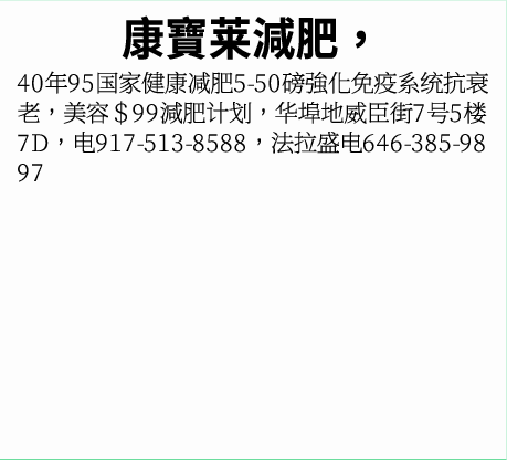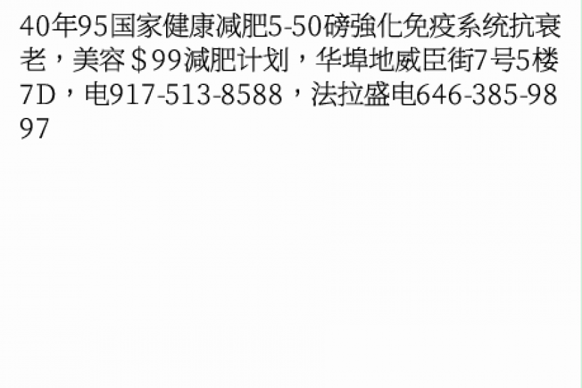 40年95国家健康减肥5-50磅強化免疫系统抗衰老,美容$99減肥计划,华埠地威臣街7号5楼7D,电917-513-8588,法拉盛电646-385-9897