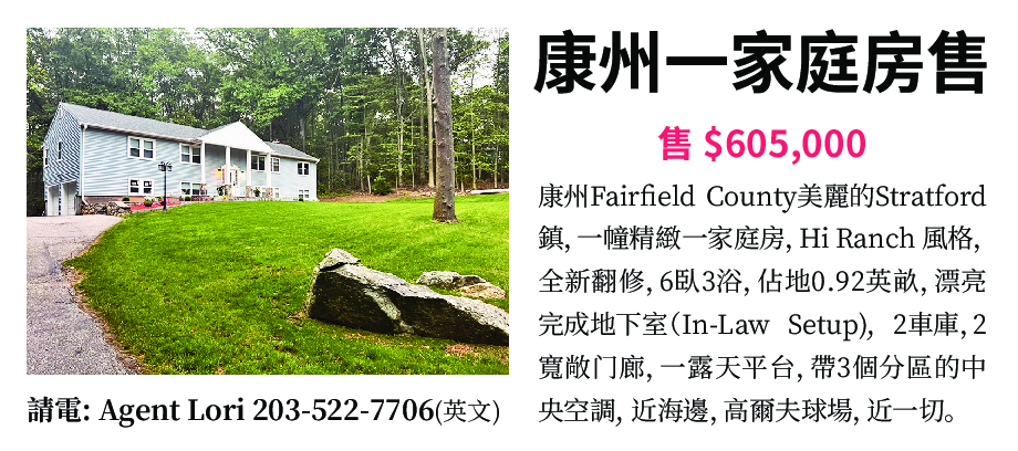 康州Fairfield County美麗的Stratford鎮,一幢精緻一家庭房,Hi Ranch 風格,全新翻修,6臥3浴,佔地 .92英畝,漂亮完成地下室(In-Law Setup), 2車庫,2 寬敞门廊,一露天平台,帶3個分區的中央空調, 近海邊,高爾夫球場,近一切,售$605,000,