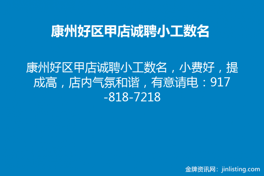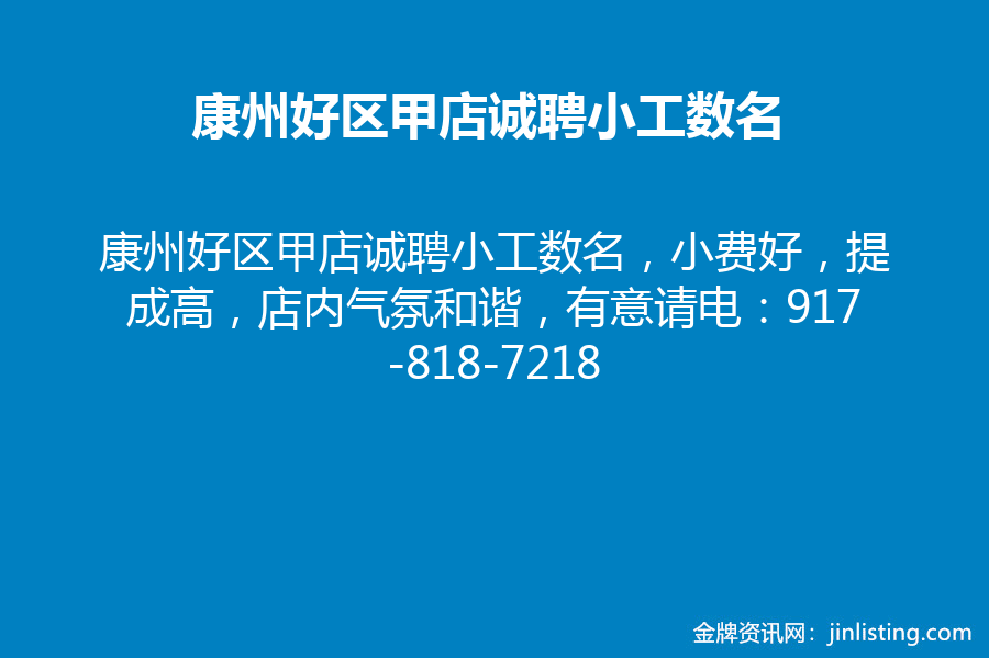 康州好区甲店诚聘小工数名,小费好,提成高,店内气氛和谐,有意请电:917-818-7218