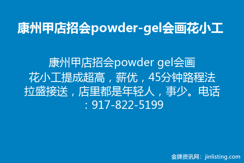 康州甲店招会powder gel会画花小工提成超高,薪优,45分钟路程法拉盛接送,店里都是年轻人,事少。电话:917-822-5199