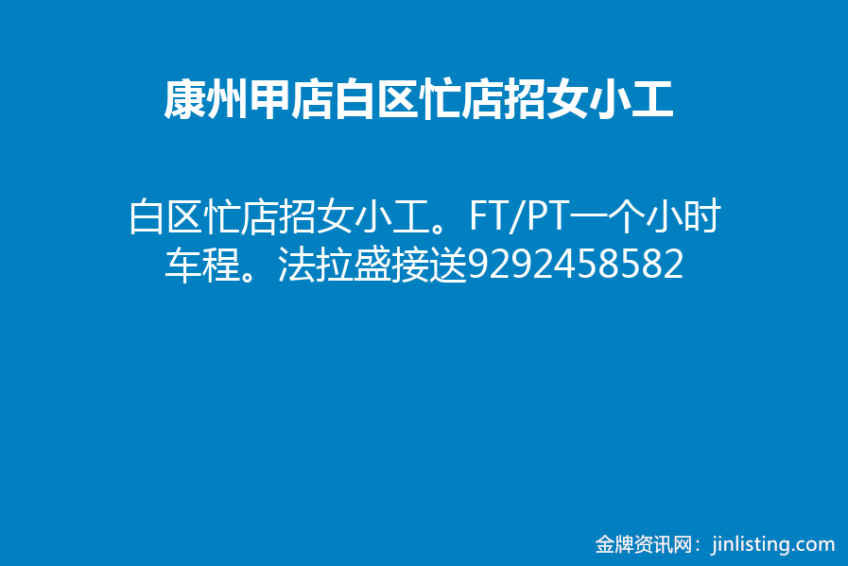 康州甲店白区忙店招女小工。FT/PT一个小时车程。法拉盛接送9292458582。