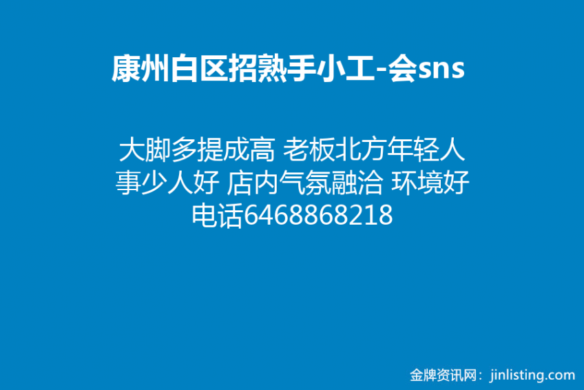 康州白区招熟手小工 会sns 大脚多提成高 老板北方年轻人 事少人好 店内气氛融洽 环境好 ☎电话6468868218