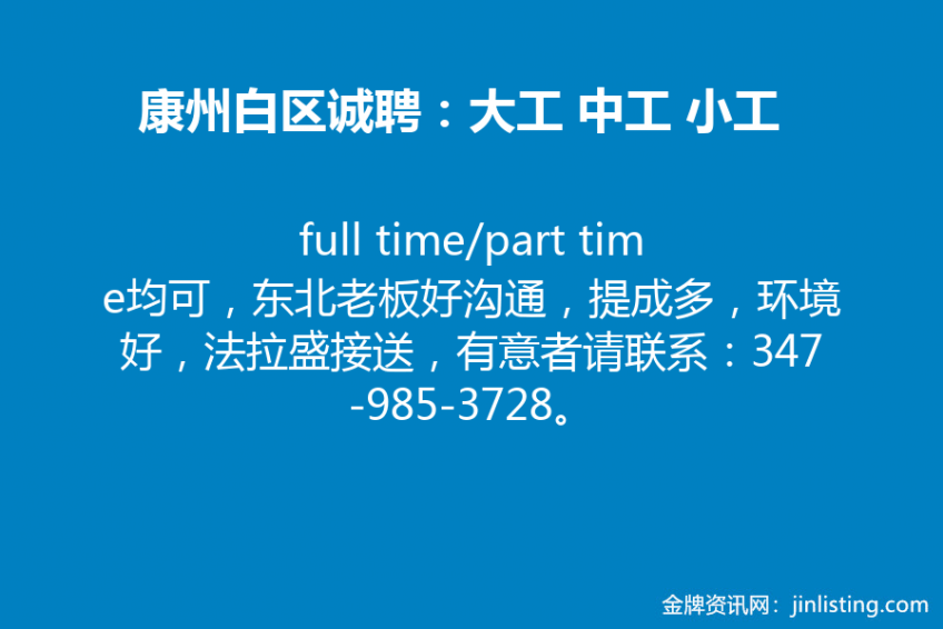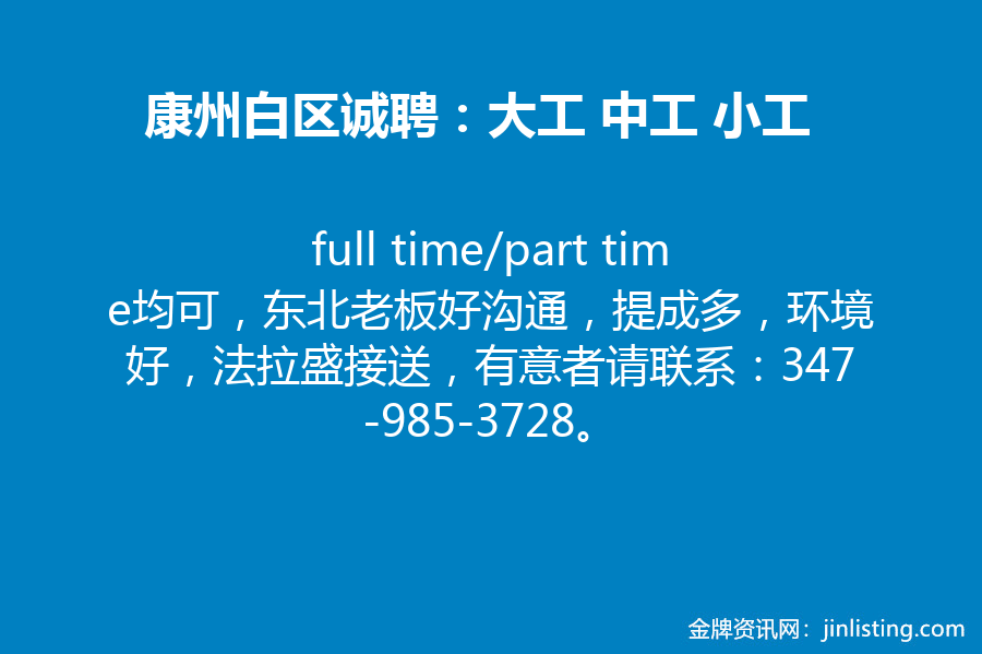 康州白区诚聘:大工 中工 小工 ,full time/part time均可,东北老板好沟通,提成多,环境好,法拉盛接送,有意者请联系:347-985-3728。