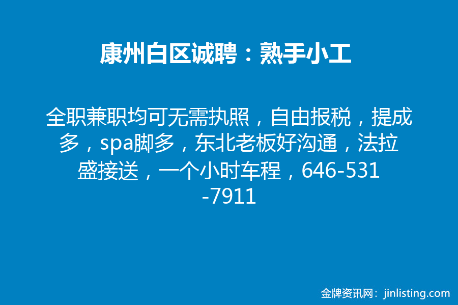 康州白区诚聘:熟手小工,全职兼职均可,无需执照,自由报税,提成多,spa脚多,东北老板好沟通,法拉盛接送,一个小时车程,646-531-7911。