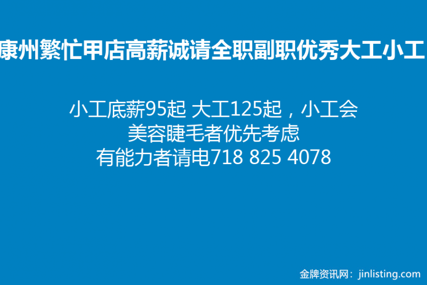 , 小工底薪95起 大工125起,小工会美容睫毛者优先考虑 有能力者请电718 825 4078(东北人店,老板随和好相处),提成多, 小费好, 店内气氛融洽。老板随和好相处。处事公道。周一到周六7点下班 周日6点下班•法拉盛接送。pt/ft前台或者经理 前台要求性格开朗 英文流利 有无经验或学生均可