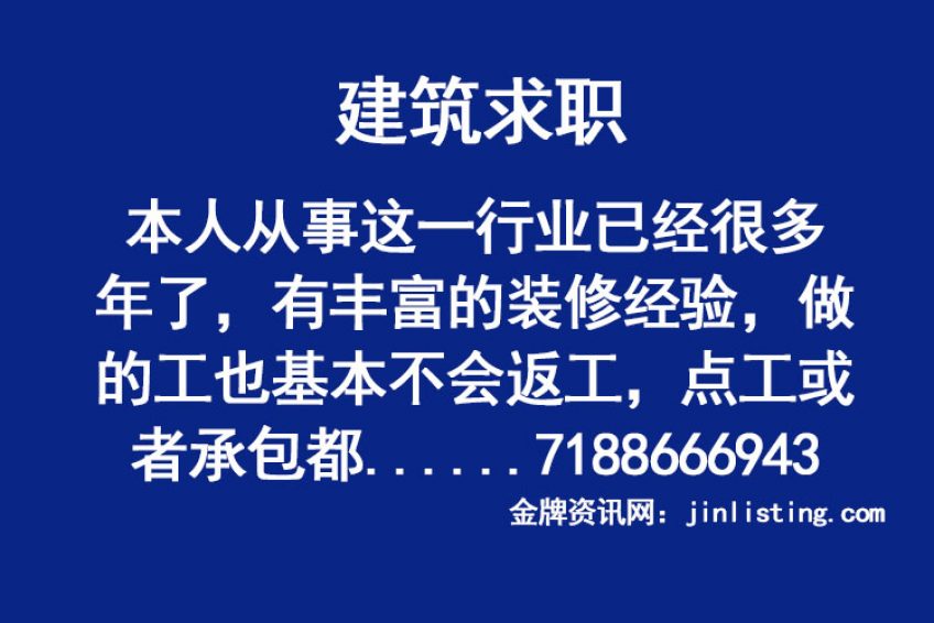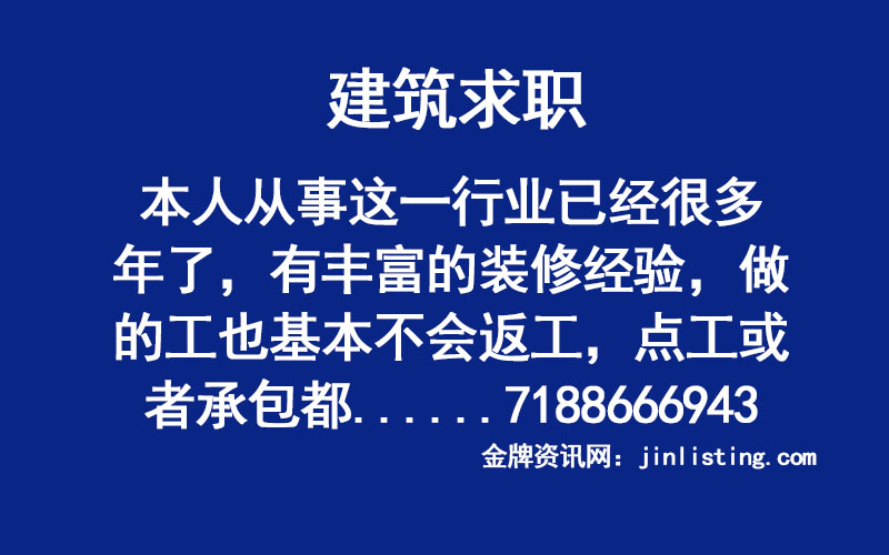 建筑求职 本人从事这一行业已经很多年了,有丰富的装修经验,做的工也基本不会返工,点工或者承包都可以的。有需要的老板可以电话☎️7188666943