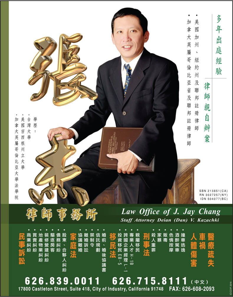 张杰律师毕业於台湾大学,美国密西根州立大学,加拿大英属哥伦比亚大学法学院。张律师是在法律界中少数同时拥有加州、纽约州和加拿大英属哥伦比亚省执照的专业律师,目前除了为主流社会服务之外,更希望能为华人社会服务,张律师专精於商业诉讼、破产法、房地产纠纷、家庭法及移民法等法律服务。