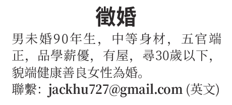 男未婚90年生,中等身材,五官端正,品学薪优,有屋,寻30岁以下,貌端健康善良女性为婚