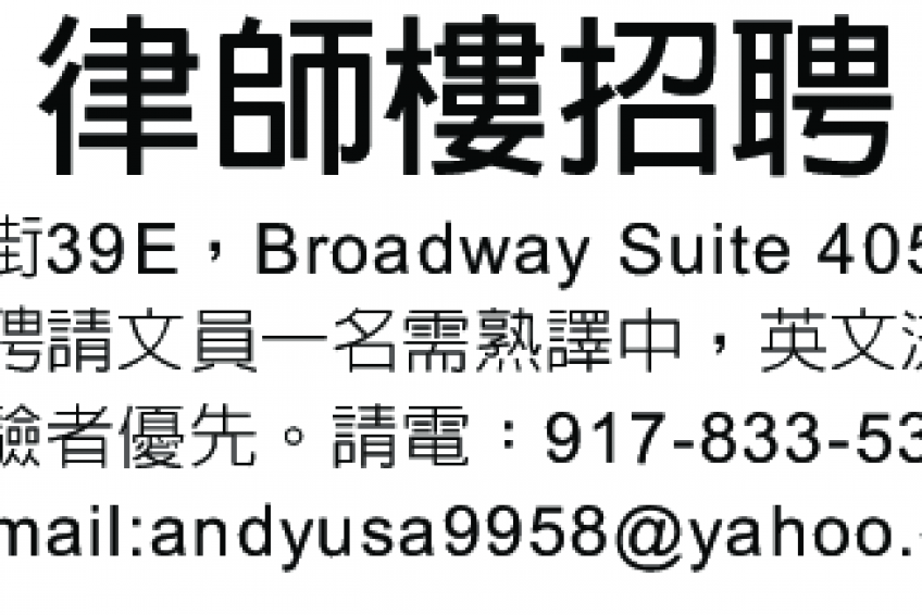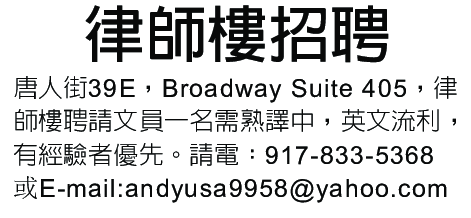 唐人街39E,Br0adway Suite 405,律師樓聘請文員一名需熟譯中,英文流利,有經驗者優先。有意者請電:917-833-5368或丨E-mail:andyusa9958@yahoo.com