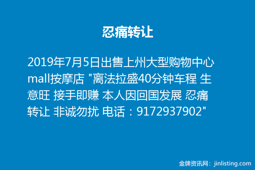 出售上州大型购物中心mall按摩店 “离法拉盛40分钟车程 生意旺 接手即赚 本人因回国发展 忍痛转让 非诚勿扰 电话:9172937902”
