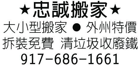 大小型搬家 ● 外州特價 拆裝免費 清垃圾收廢鐵 917-686-1661