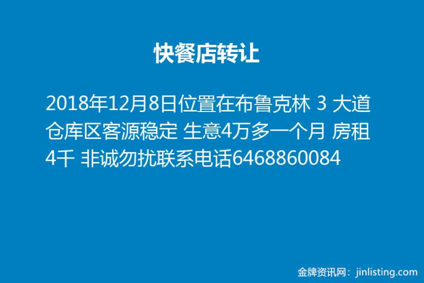快餐店转让 位置在布鲁克林 3 大道 仓库区客源稳定 生意4万多一个月 房租4千 非诚勿扰联系电话6468860084