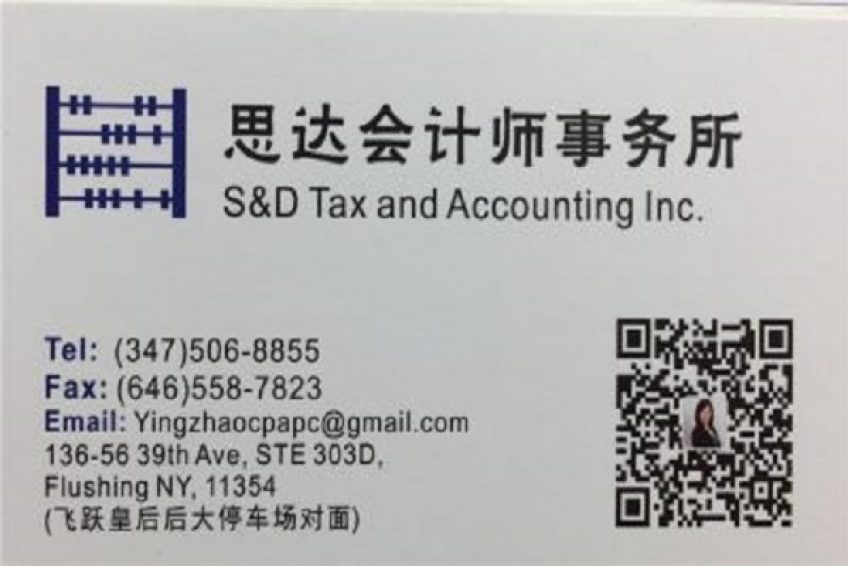 S&D Tax and Accounting Inc. Tel: (347)506-8855 Fax: (646)558-7823 Email: Yingzhaocpapc@gmail.com 地址:136-56 39th Ave, STE 303D, Flushing NY, 11354