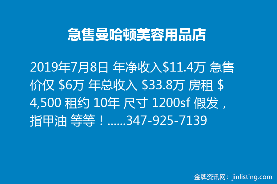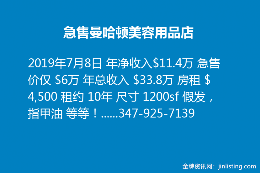 “急售曼哈顿美容用品店 年净收入$11.4万 急售价仅 $6万 年总收入 $33.8万 房租 $4,500 租约 10年 尺寸 1200sf 假发,指甲油 等等! 营业时间 10am-7pm,6天 ☎️:347-925-7139 新星地产 phillip(任先生) E-mail: moneynewstar@gmail.com”