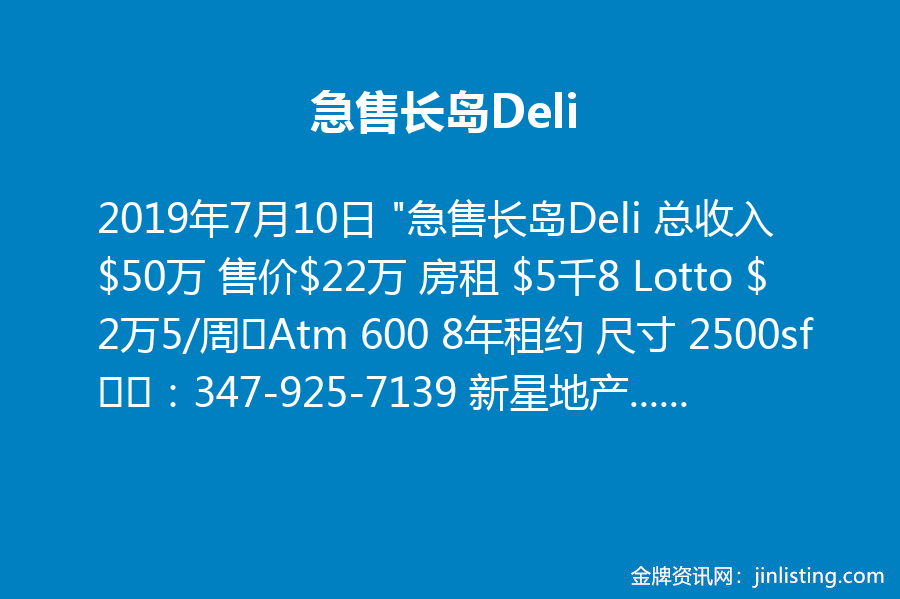 “急售长岛Deli 总收入$50万 售价$22万 房租 $5千8 Lotto $2万5/周 Atm 600 8年租约 尺寸 2500sf ☎️:347-925-7139 新星地产 phillip(任先生) E-mail: moneynewstar@gmail.com”