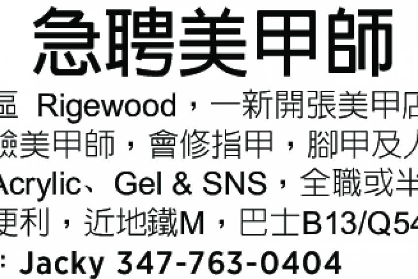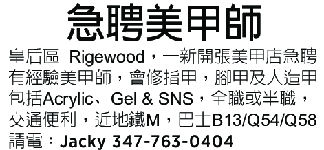 皇后區Rigewood,一新開張美甲店, 急聘有經驗美甲師,會修指甲,腳甲,及人造甲包括Acrylic, Gel & SNS. 全職或半職,交通便利,近地鐵M, 巴士B13, Q54 & Q58。